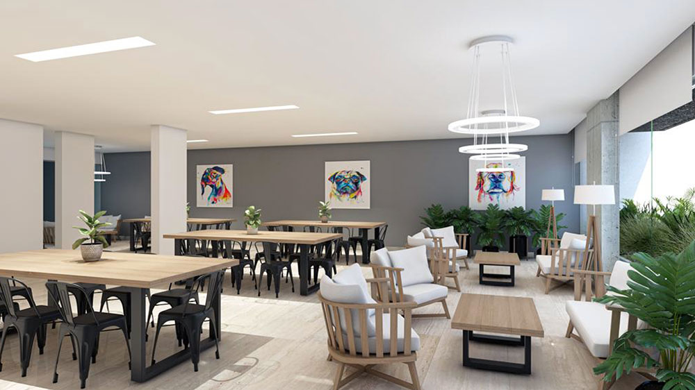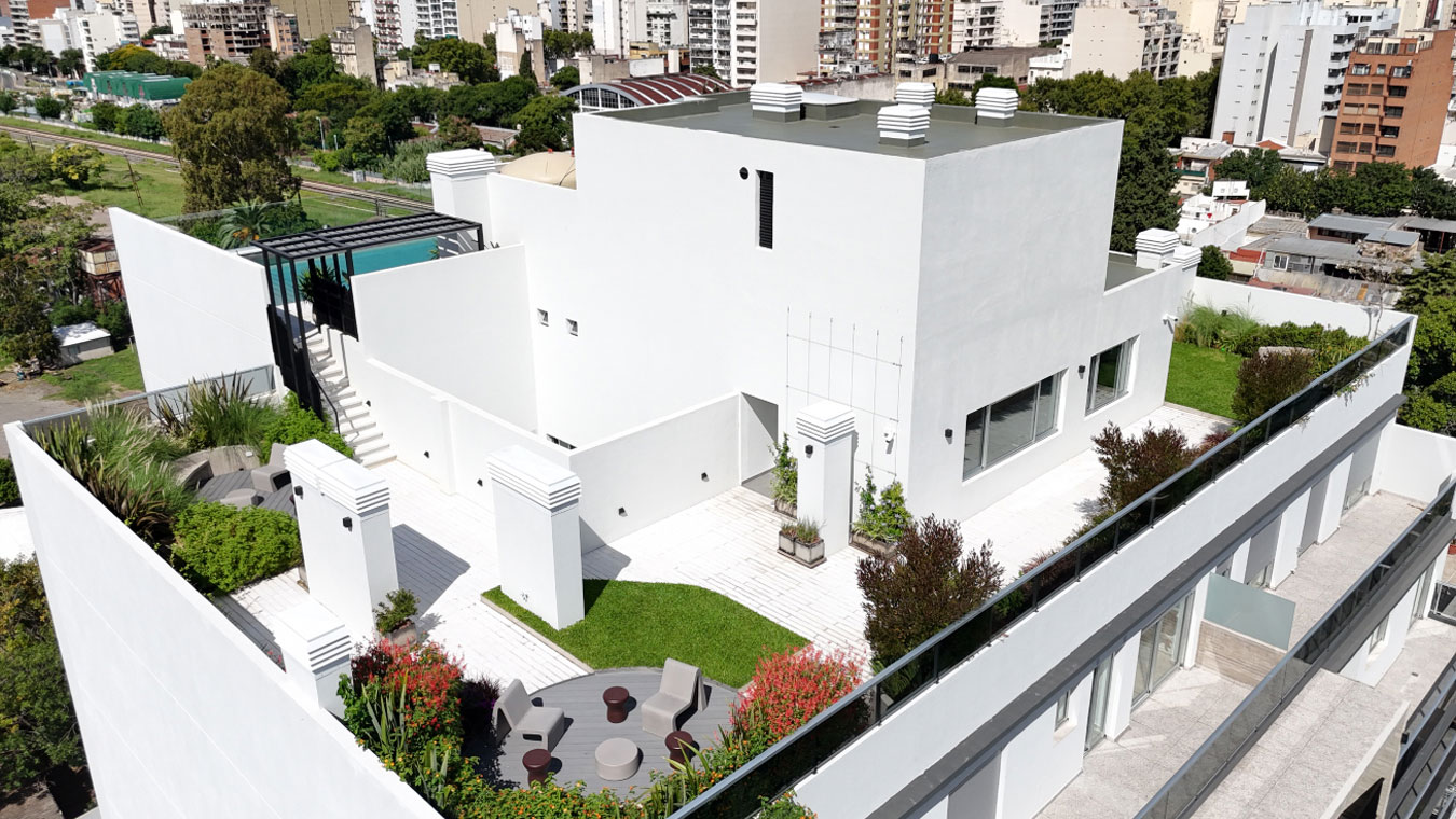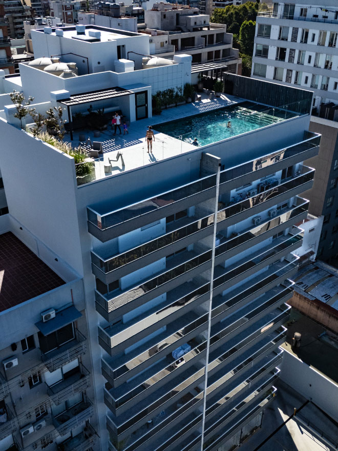Las cocheras se sitúan en subsuelo y planta baja. El edificio contará con SUM en planta baja, gimnasio y pileta con terraza verde en el piso 11 con vistas panorámicas hacia el barrio.